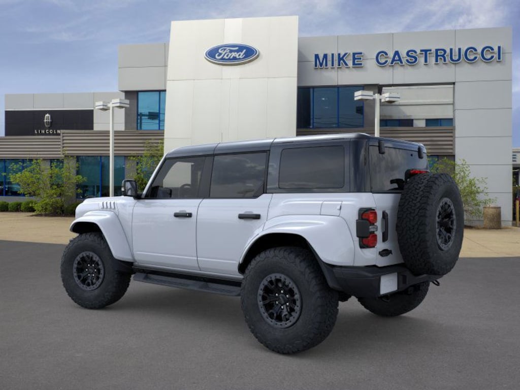 This 2025 Ford Bronco Raptor comes equipped with Equipment Group 374A Lux Package, Raptor Black Appearance Package (Gloss Black Sideview Mirror Skull Caps, Interior Carbon Fiber Pack, and Wheels: 17" Dark Carbonized Gray Alloy Painted), 12 Speakers, 4-Wheel Disc Brakes, ABS brakes, Air Conditioning, Alloy wheels, AM/FM radio: SiriusXM with 360L, Auto High-beam Headlights, Auto-dimming Rear-View mirror, Automatic temperature control, Brake assist, Compass, Connected Navigation, Convertible HardTop, Convertible roof lining, Delay-off headlights, Driver door bin, Driver vanity mirror, Dual front impact airbags, Dual front side impact airbags, Electronic Stability Control, Emergency communication system: 911 Assist, Exterior Parking Camera Rear, Front anti-roll bar, Front Bucket Seats, Front Center Armrest, Front dual zone A/C, Front fog lights, Front reading lights, Front wheel independent suspension, Fully automatic headlights, Garage door transmitter, Glass rear window, Hard Top Sound Deadening Headliner, Heated door mirrors, Heated front seats, Heated steering wheel, Illuminated entry, Integrated roll-over protection, Leather Shift Knob, Leather-Trimmed/Vinyl Bucket Seats, Low tire pressure warning, Marine Grade Vinyl Bucket Seats, Navigation system: Connected Navigation, Occupant sensing airbag, Outside temperature display, Overhead airbag, Overhead console, Panic alarm, Passenger door bin, Passenger vanity mirror, Power door mirrors, Power steering, Power windows, Radio data system, Radio: B&O Sound System by Bang & Olufsen, Rear anti-roll bar, Rear seat center armrest, Rear window defroster, Rear window wiper, Rear-Window Defroster & Washer, Remote keyless entry, Security system, Shadow Black Painted Hard Top, SiriusXM w/360L, Speed control, Split folding rear seat, Steering wheel mounted audio controls, SYNC 4, Tachometer, Telescoping steering wheel, Tilt steering wheel, Traction control, Trip computer, Turn signal indicator mirrors, Variably intermittent wipers, Voltmeter, and Wheels: 17" Black High Gloss-Painted Aluminum.