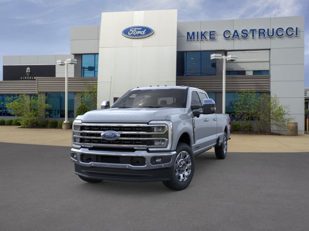 This 2025 Ford F-250 SuperDuty King Ranch comes equipped with 5th Wheel/Gooseneck Hitch Prep Package, Chrome Package (Chrome Door Handles, Chrome Exhaust Tip, Chrome Front & Rear Bumpers, Unique Chrome Mirror Caps, and Wheels: 20" Chrome PVD Aluminum), F-250 >10K GVWR Package, FX4 Off-Road Package (Hill Descent Control, Off-Road Specifically Tuned Shock Absorbers, and Unique FX4 Off-Road Box Decal), Order Code 700A, 4WD, 14 Speakers, 3.73 Axle Ratio, 4-Wheel Disc Brakes, 410 Amp Dual Alternators, ABS brakes, Adjustable pedals, Air Conditioning, Alloy wheels, AM/FM radio: SiriusXM with 360L, Auto High-beam Headlights, Auto tilt-away steering wheel, Auto-dimming Rear-View mirror, Automatic temperature control, Brake assist, Compass, Delay-off headlights, Driver door bin, Driver vanity mirror, Dual front impact airbags, Dual front side impact airbags, Electronic Stability Control, Electronic-Locking w/3.31 Axle Ratio, Emergency communication system: SYNC 4 911 Assist, Flow-Through Console, Front & Rear Wheel Well Liners (Pre-Installed), Front anti-roll bar, Front Bucket Seats, Front Center Armrest, Front dual zone A/C, Front fog lights, Front reading lights, Fully automatic headlights, Garage door transmitter, Gooseneck Hitch Kit (Pre-Installed), Heads-Up Display, Heated door mirrors, Heated front seats, Heated rear seats, Heated steering wheel, Illuminated entry, Leather steering wheel, LED Roof Clearance Lights, Low tire pressure warning, Memory seat, Navigation System, Outside temperature display, Overhead airbag, Overhead console, Panic alarm, Passenger door bin, Passenger vanity mirror, Pedal memory, Power door mirrors, Power driver seat, Power passenger seat, Power steering, Power windows, Pro Power Onboard - 2kW, Radio: B&O Unleashed Sound System by Bang & Olufsen, Rain sensing wipers, Rapid-Heat Supplemental Cab Heater, Rear reading lights, Rear seat center armrest, Rear step bumper, Rear window defroster, Remote keyless entry, Security system, SiriusXM Radio w/360L, Speed control, Split folding rear seat, Steering wheel memory, Steering wheel mounted A/C controls, Steering wheel mounted audio controls, SYNC 4 w/Enhanced Voice Recognition, Tachometer, Telescoping steering wheel, Tilt steering wheel, Tough Bed Spray-In Bedliner, Traction control, Trip computer, Turn signal indicator mirrors, Unique King Ranch Leather 40/Console/40 Seats, Variably intermittent wipers, Ventilated front seats, and Wheels: 20" Bright Machined Cast Aluminum.