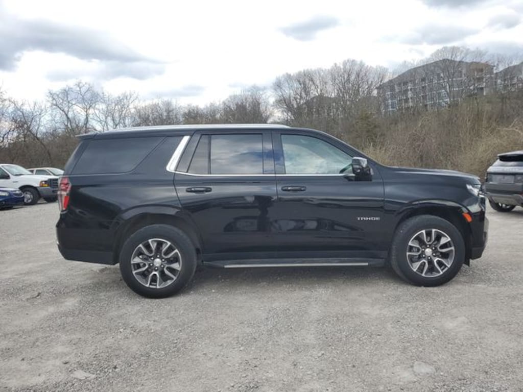 This 2022 Chevrolet Tahoe LT comes equipped with Driver Alert Package (Lane Change Alert w/Side Blind Zone Alert and Rear Cross Traffic Alert), License Plate Front Mounting Package, LT Signature Plus Package (Dual-Pane Power Panoramic Sunroof), Luxury Package (2nd Row Pwr Release 60/40 Split-Folding Bench Seat, 3rd Row 60/40 Power-Folding Split-Bench Seat, HD Surround Vision, Heated 2nd Row Outboard Seats, Heated Steering Wheel, Memory Settings, Outside Heated Power-Adjustable Mirrors, Power Tilt & Telescopic Steering Column, and Rear Pedestrian Alert), Preferred Equipment Group 1LT (1st & 2nd Row Color-Keyed Carpeted Floor Mats, Auto-Dimming Inside Rear-View Mirror, Automatic Stop/Start, Bose 9-Speaker Stereo Audio System Feature, Bright Front & Rear Door Sill Plates, Color-Keyed Carpeting Floor Covering, Driver & Front Outboard Passenger Airbags, Enhanced Driver Information Center, Floor Console w/Storage Area, Hands-Free Rear Power Programmable Liftgate, Infotainment Display, Leather-Wrapped Steering Wheel, LED Daytime Running Lamps, Memory Settings for Driver, Remote Start, SiriusXM Radio w/360L, Start/Stop System Disable Button, Universal Home Remote, and Wireless Charging), 4WD, Black Leather, 10-Way Power Driver & Passenger Seat Adjusters, 3.23 Rear Axle Ratio, 3rd row seats: split-bench, 4-Wheel Disc Brakes, 9 Speakers, ABS brakes, Air Conditioning, Alloy wheels, AM/FM radio: SiriusXM with 360L, Apple CarPlay/Android Auto, Auto High-beam Headlights, Auto-dimming Rear-View mirror, Automatic temperature control, Brake assist, Bumpers: body-color, Compass, Delay-off headlights, Driver door bin, Driver vanity mirror, Dual front impact airbags, Dual front side impact airbags, Electronic Stability Control, Emergency communication system: OnStar and Chevrolet connected services capable, Four wheel independent suspension, Front anti-roll bar, Front Bucket Seats, Front Center Armrest, Front dual zone A/C, Front High-Back Reclining Bucket Seats, Front reading lights, Fully automatic headlights, Garage door transmitter, Heated door mirrors, Heated Driver & Front Passenger Seats, Heated front seats, Illuminated entry, Leather steering wheel, Leather-Appointed Seat Trim, Low tire pressure warning, Memory seat, Navigation System, Not Equipped w/Steering Column Lock, Occupant sensing airbag, Outside temperature display, Overhead airbag, Overhead console, Panic alarm, Passenger door bin, Passenger vanity mirror, Power door mirrors, Power driver seat, Power Liftgate, Power passenger seat, Power Release 2nd Row Bucket Seats, Power steering, Power windows, Premium audio system: Chevrolet Infotainment System 3, Premium Smooth Ride Suspension, Radio: Chevrolet Infotainment 3 Premium System, Rain sensing wipers, Rear air conditioning, Rear anti-roll bar, Rear reading lights, Rear seat center armrest, Rear window defroster, Rear window wiper, Remote keyless entry, Roof rack: rails only, Security system, Speed control, Speed-sensing steering, Split folding rear seat, Spoiler, Steering wheel mounted audio controls, Tachometer, Telescoping steering wheel, Tilt steering wheel, Traction control, Trip computer, Variably intermittent wipers, Voltmeter, Wheels: 18" x 8.5" Bright Silver Painted Aluminum, and Wheels: 20" x 9" Painted Aluminum.