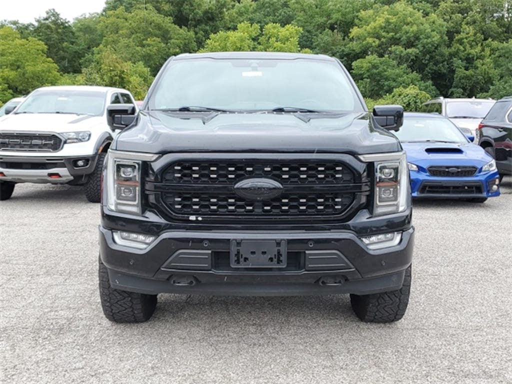 This 2021 Ford F-150 King Ranch comes equipped with Equipment Group 601A High (20" Machined-Aluminum Wheels, Power Tailgate, Power-Deployable Running Boards, and Radio: B&O Unleashed Sound System by Bang & Olufsen), Ford Co-Pilot360 Active 2.0 Package (Active Park Assist 2.0 and BlueCruise Hands-Free Driving), FX4 Off-Road Package (4x4 FX4 Off-Road Bodyside Decal, Hill Descent Control, Monotube Rear Shocks, Off-Road Tuned Front Shock Absorbers, Rock Crawl Mode, and Tray Style Floor Liner), Max Trailer Tow Package (Class IV Trailer Hitch Receiver, Extended Range 36 Gallon Fuel Tank, Integrated Trailer Brake Controller, and Pro Trailer Backup Assist), 3.5L PowerBoost Full-Hybrid V6, 4WD, 18" Machined-Aluminum Wheels, 3.31 Axle Ratio, 360 Degree Camera, 4-Wheel Disc Brakes, 8 Speakers, ABS brakes, Adjustable pedals, Air Conditioning, Alloy wheels, AM/FM radio: SiriusXM with 360L, Auto High-beam Headlights, Auto tilt-away steering wheel, Auto-dimming door mirrors, Auto-dimming Rear-View mirror, Automatic temperature control, Brake assist, Compass, Delay-off headlights, Driver door bin, Driver vanity mirror, Dual front impact airbags, Dual front side impact airbags, Electronic Locking w/3.73 Axle Ratio, Electronic Stability Control, Emergency communication system: SYNC 4 911 Assist, Exterior Parking Camera Rear, Front anti-roll bar, Front Bucket Seats, Front Center Armrest, Front dual zone A/C, Front fog lights, Front reading lights, Front wheel independent suspension, Fully automatic headlights, Garage door transmitter, Genuine wood console insert, Genuine wood dashboard insert, Genuine wood door panel insert, Heated door mirrors, Heated front seats, Heated rear seats, Heated steering wheel, Illuminated entry, Interior Work Surface, King Ranch Leather Bucket Seats, LED Sideview Mirror Spotlights, Low tire pressure warning, Max Recline Driver & Passenger Seat, Memory seat, Navigation system: Connected Navigation (90-Day Trial), Occupant sensing airbag, Outside temperature display, Overhead airbag, Overhead console, Panic alarm, Partitioned Lockable Fold-Flat Storage, Passenger door bin, Passenger vanity mirror, Pedal memory, Power door mirrors, Power driver seat, Power passenger seat, Power steering, Power windows, Pro Power Onboard - 7.2KW, Radio data system, Radio: B&O Sound System by Bang & Olufsen, Rain sensing wipers, Rear reading lights, Rear seat center armrest, Rear step bumper, Rear window defroster, Remote keyless entry, Security system, Speed control, Speed-sensing steering, Split folding rear seat, Steering wheel memory, Steering wheel mounted audio controls, SYNC 4 w/Enhanced Voice Recognition, Tachometer, Telescoping steering wheel, Tilt steering wheel, Traction control, Trip computer, Turn signal indicator mirrors, Twin Panel Moonroof, Variably intermittent wipers, Ventilated front seats, and Voltmeter.