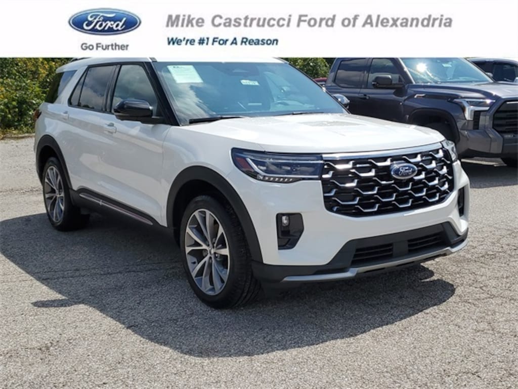 This 2025 Ford Explorer Platinum comes equipped with 4WD, 14 Speakers, 3.58 Non-Limited Slip Rear Axle, 3rd row seats: bench, 4-Wheel Disc Brakes, ABS brakes, ActiveX Trimmed Sport Captain's Chairs, Air Conditioning, Alloy wheels, Apple CarPlay/Android Auto, Auto High-beam Headlights, Auto-dimming door mirrors, Auto-dimming Rear-View mirror, Automatic temperature control, Brake assist, Bumpers: body-color, Compass, Delay-off headlights, Driver door bin, Driver vanity mirror, Dual front impact airbags, Dual front side impact airbags, Electronic Stability Control, Emergency communication system: 911 Assist, Exterior Parking Camera Rear, Four wheel independent suspension, Front anti-roll bar, Front Bucket Seats, Front Center Armrest, Front dual zone A/C, Front fog lights, Front reading lights, Fully automatic headlights, Garage door transmitter, Heated door mirrors, Heated front seats, Heated rear seats, Heated steering wheel, Illuminated entry, Knee airbag, Leather steering wheel, Low tire pressure warning, Memory seat, Navigation System, Occupant sensing airbag, Outside temperature display, Overhead airbag, Overhead console, Panic alarm, Passenger door bin, Passenger vanity mirror, Power door mirrors, Power driver seat, Power Liftgate, Power moonroof, Power passenger seat, Power steering, Power windows, Radio data system, Radio: B&O Sound System by Bang & Olufsen w/HD, Rain sensing wipers, Rear air conditioning, Rear anti-roll bar, Rear reading lights, Rear window defroster, Rear window wiper, Remote keyless entry, Security system, Speed control, Speed-sensing steering, Speed-Sensitive Wipers, Split folding rear seat, Spoiler, Steering wheel mounted audio controls, Tachometer, Telescoping steering wheel, Tilt steering wheel, Traction control, Trip computer, Turn signal indicator mirrors, Variably intermittent wipers, Ventilated front seats, and Wheels: 20" Luster Nickel-Painted Aluminum.