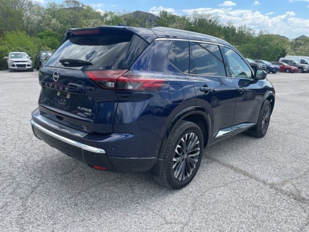 This 2024 Nissan Rogue Platinum comes equipped with Platinum Premium Package (Head-Up Display, Motion-Activated Power Liftgate, Rear Door Sunshades, Rear Heated Seats, and Tri-Zone Automatic Temperature Control), AWD, 10 Speakers, 4-Wheel Disc Brakes, 5.676 Axle Ratio, ABS brakes, Air Conditioning, Alloy wheels, AM/FM radio: SiriusXM w/360L, Auto High-beam Headlights, Auto-dimming Rear-View mirror, Automatic temperature control, Bose Premium Audio System, Brake assist, Bumpers: body-color, Chrome Rear Bumper Protector, Delay-off headlights, Driver door bin, Driver vanity mirror, Dual front impact airbags, Dual front side impact airbags, Electronic Stability Control, Emergency communication system: NissanConnect Services, First Aid Kit, Floor Mats w/2-Piece Cargo Area Protector, Four wheel independent suspension, Frameless Rearview Mirror w/Universal Remote, Front anti-roll bar, Front Bucket Seats, Front Center Armrest, Front dual zone A/C, Front reading lights, Fully automatic headlights, Heated door mirrors, Heated Front Bucket Seats, Heated front seats, Heated steering wheel, Illuminated entry, Illuminated Kick Plates, Knee airbag, Leather steering wheel, Low tire pressure warning, Memory seat, Navigation system: NissanConnect with Navigation and Services, NissanConnect featuring Apple CarPlay and Android Auto, Occupant sensing airbag, Outside temperature display, Overhead airbag, Overhead console, Panic alarm, Passenger door bin, Passenger vanity mirror, Power door mirrors, Power driver seat, Power Liftgate, Power moonroof, Power passenger seat, Power steering, Power windows, Quilted Semi-Aniline Leather-Appointed Seat Trim, Radio data system, Radio: AM/FM NissanConnect w/Navigation, Rear anti-roll bar, Rear reading lights, Rear seat center armrest, Rear side impact airbag, Rear window defroster, Rear window wiper, Remote keyless entry, Security system, Speed control, Speed-Sensitive Wipers, Splash Guards (Black - Set of 4), Split folding rear seat, Spoiler, Steering wheel mounted audio controls, Tachometer, Telescoping steering wheel, Tilt steering wheel, Traction control, Trip computer, Turn signal indicator mirrors, Variably intermittent wipers, and Wheels: 19" Unique Dark Painted Aluminum Alloy.